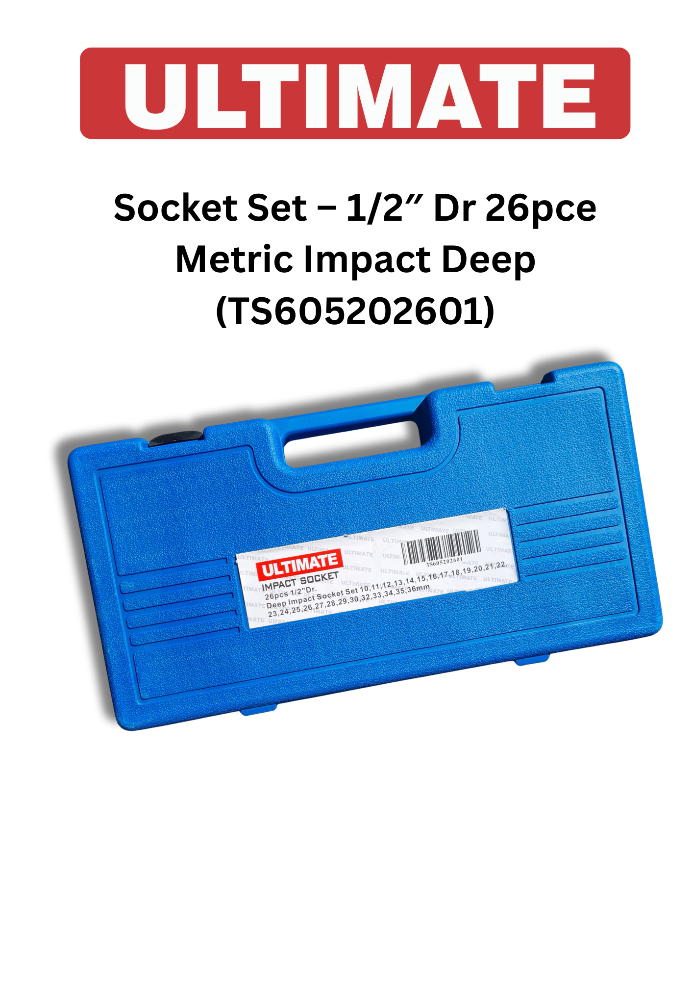 The Ultimate Tools 26-Piece 1/2″ Drive 6-Point Metric Deep Socket Set (TS605202601) is built for high performance and long-lasting reliability, making it ideal for demanding, everyday use. Constructed from premium chrome molybdenum alloy steel that is drop-forged and heat-treated, each deep socket meets strict DIN 2121 & 2129 standards for strength and precision. The set includes 26 deep metric sockets ranging from 10mm to 36mm, all housed in a rugged blow-mold case for secure storage and easy portability. Backed by a 12-month warranty, this professional-grade set is perfect for mechanics, technicians, and serious DIYers who need extra reach and dependable performance.