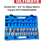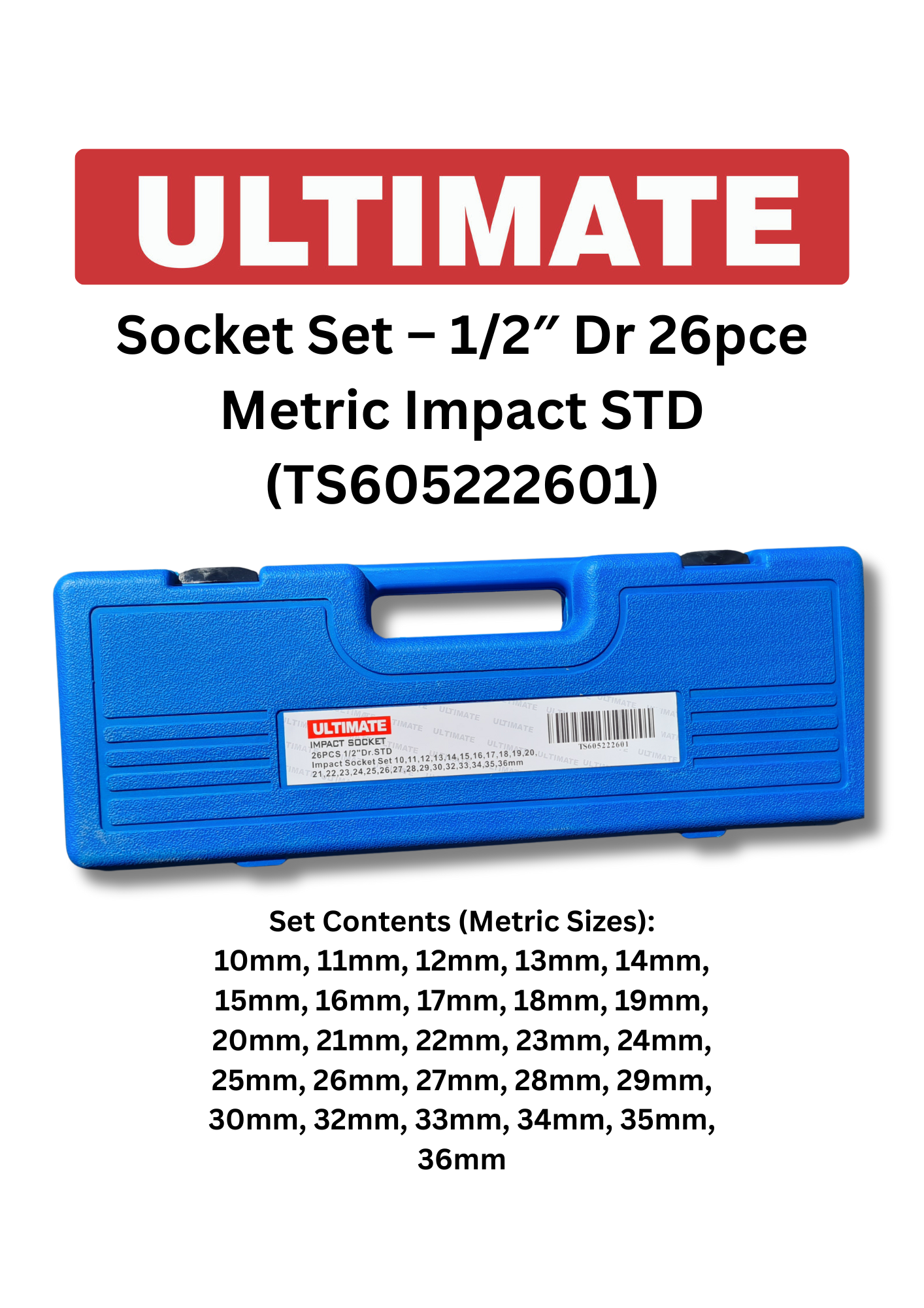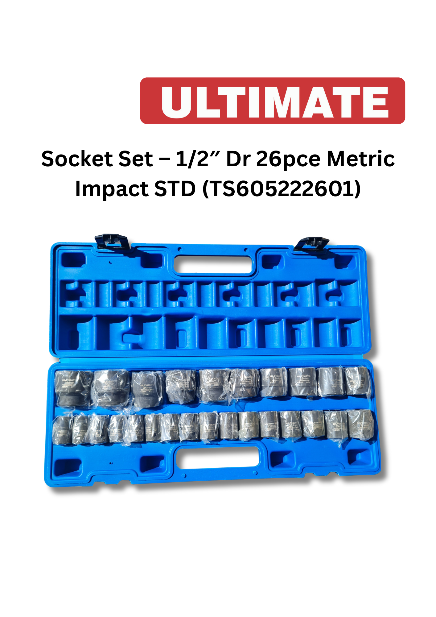 The Ultimate Tools 26-Piece 1/2″ Drive 6-Point Metric STD Socket Set (TS605222601) is a professional-grade socket set designed for durability, precision, and everyday performance. Made from high-strength chrome molybdenum alloy steel, each socket is drop-forged, heat-treated, and tested to meet strict DIN 2121 & 2129 standards. The 6-point sockets range from 10mm to 36mm, making it a versatile choice for a variety of metric applications. Housed in a durable blow-mold case for organized storage and easy transport, the set also comes with a 12-month warranty covering material and workmanship defects. Ideal for mechanics, technicians, and DIY enthusiasts alike.